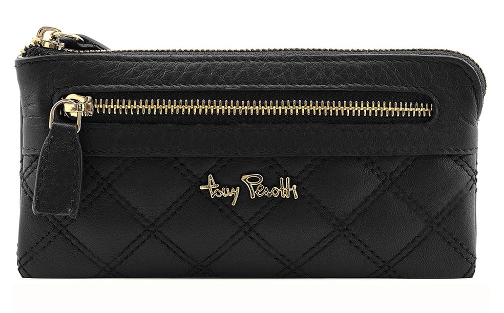 Выполнен из натуральной кожи высокого качества. Общее закрытие на молнию. Внутри одно отделение для хранения ключей с двумя кольцами на цепочках. Имеет дополнительный отсек на молнии снаружи. На лицевой стороне-фирменная надпись бренда TONY PEROTTI.
