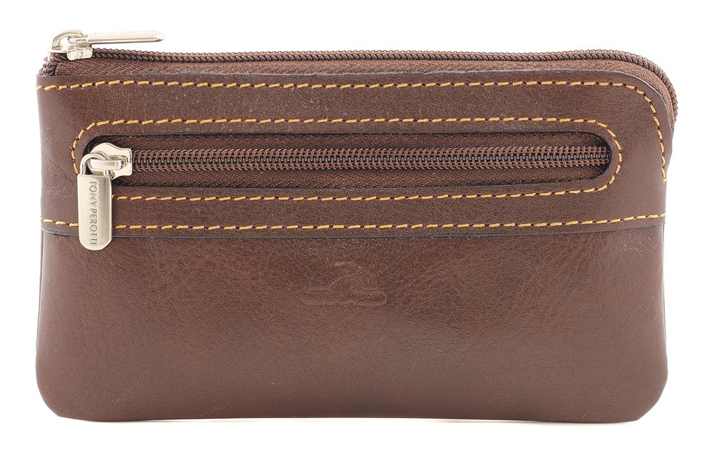 Выполнена из натуральной кожи высокого качества. Закрытие на молнию. Внутри одно отделение для ключей, а также два кольца на цепочках. Снаружи имеется плоский отсек на молнии. На лицевой стороне-фирменный логотип бренда – «черепашка».