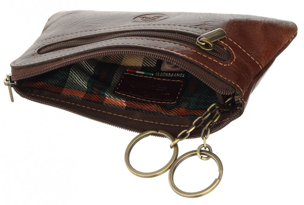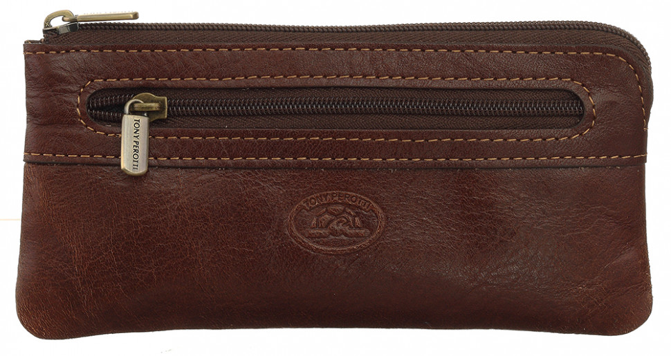 Выполнен из натуральной кожи высокого качества. Общее закрытие на молнию. Имеет одно отделение с двумя кольцами для ключей и аксессуаров. С лицевой стороны есть кармашек на молнии. На лицевой стороне –фирменный логотип бренда Tony Perotti – «черепашка».