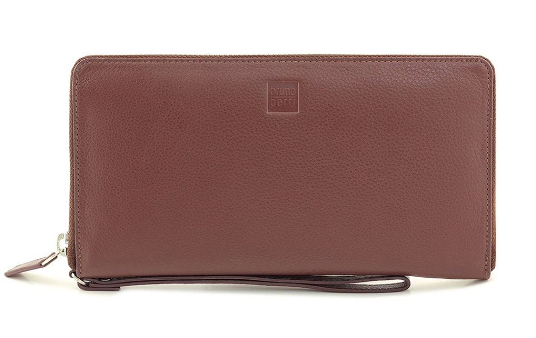 Выполнен из натуральной кожи высокого качества. Закрытие на молнию по периметру. Три отделения для купюр, отделение для мелочи на молнии, два дополнительных кармана по бокам, множество отделений для визиток и кредиток. В комплекте- ремень для носки на руке. На лицевой стороне фирменная надпись бренда –Bruno Perri.