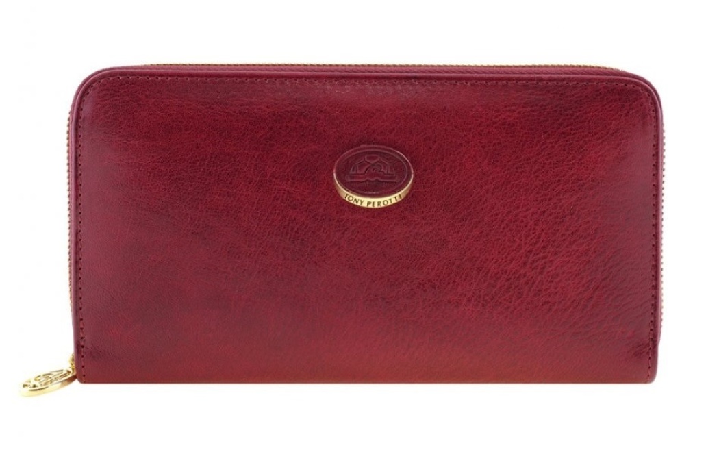 Две автономные секции для банкнот, отделение на молнии для монет, дополнительные внутренние отделения для визиток/кредиток, общая молния на открытие/закрытие. Фурнитура: золото