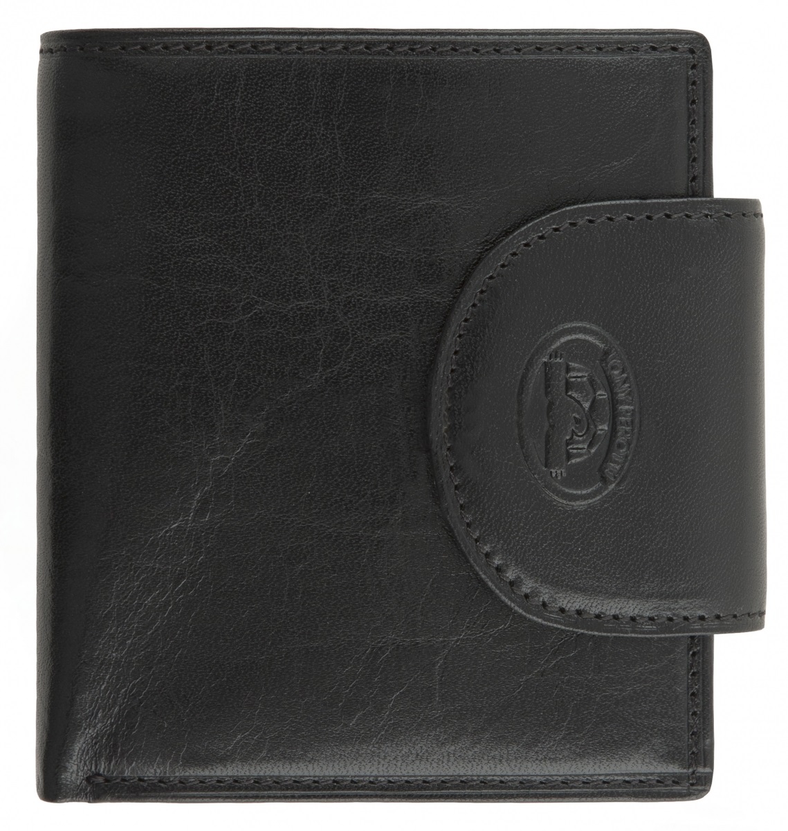 Выполнен из натуральной кожи высокого качества. Закрытие на шлевку с кнопкой. Внутри два отделения для банкнот. Монетница на кнопке, откидной сетчатый отсек с отделениями для xранения визиток/кредиток, боковые карманы. На лицевой стороне логотип бренда Tony Perotti - «черепашка».