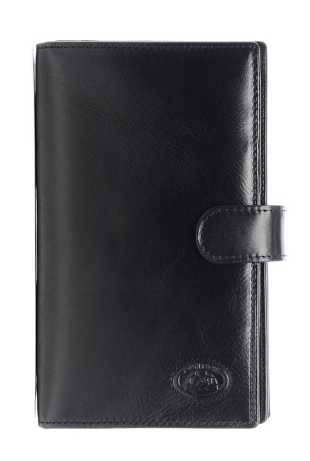 Выполнен из натуральной кожи высокого качества. Общее закрытие на шлевку с кнопкой. Внутри автономная секция для пачки банкнот, потайное отделение на молнии, боковые карманы, сетчатый карман, дополнительные внутренние отделения для визиток, кредиток. На лицевой стороне – фирменный логотип бренда «черепашка».
