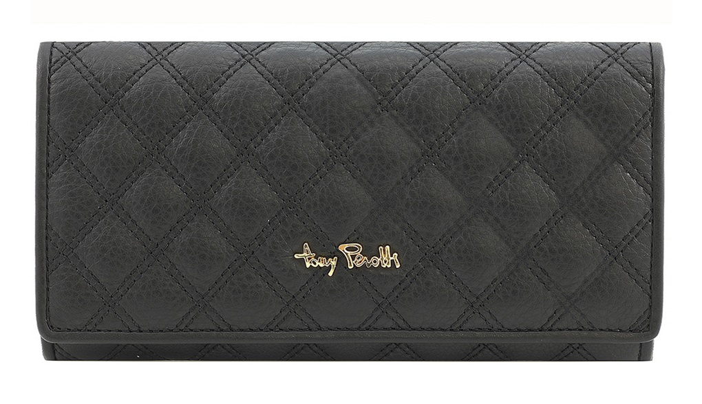 Выполнен из натуральной кожи высокого качества. Общее закрытие на кнопку. Внутри: три основных отсека, один из которых имеет стальной каркас и замок-защёлку, а также плоский карман на молнии и отсеки под визитки/кредитки. С тыльной стороны открытый карман. На лицевой стороне-фирменная надпись бренда TONY PEROTTI.