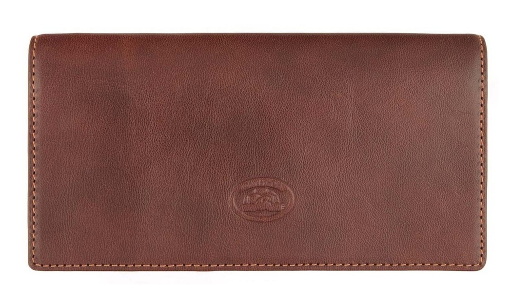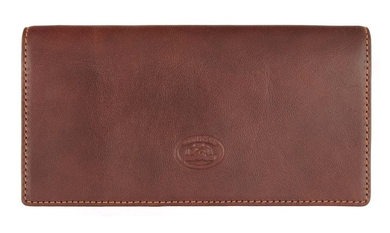 Выполнен из натуральной кожи высокого качества. Закрытие на кнопку. Внутри центральный автономный отдел с двумя кармашками для визиток/кредиток, два кармашка на молнии, так же имеется два автономных больших кармашка и шесть кармашков для визиток/кредиток. На лицевой стороне фирменный логотип бренда - «черепашка».