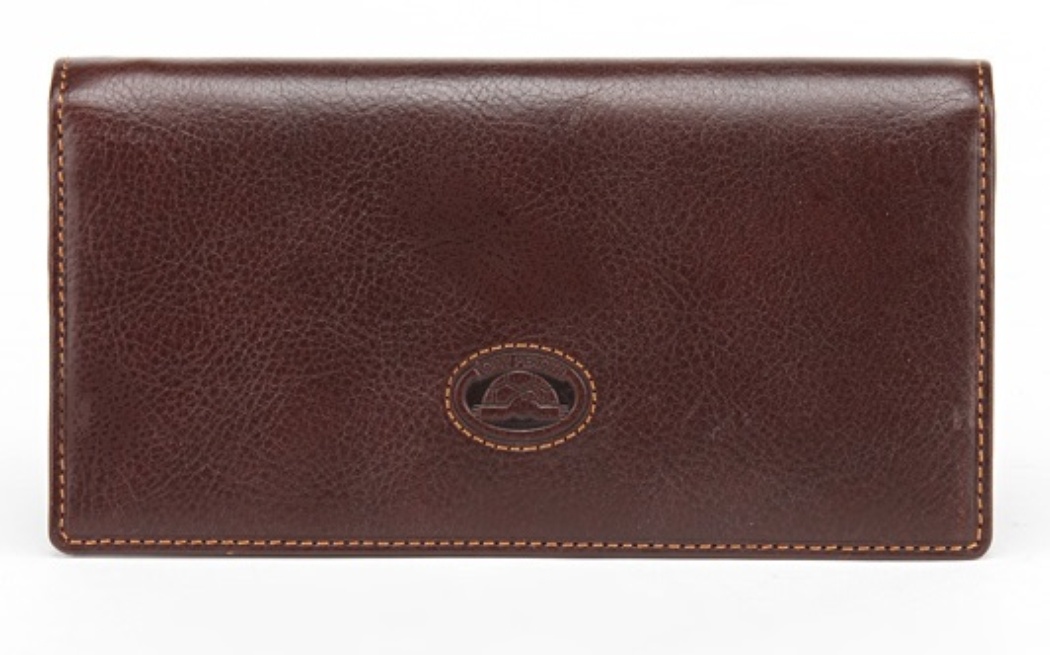 Выполнен из натуральной кожи высокого качества. Общее закрытие на кнопку. Автономная секция для банкнот, дополнительные внутренние отделения, отделение на молнии для мелочи. На лицевой стороне-фирменный логотип бренда «черепашка».