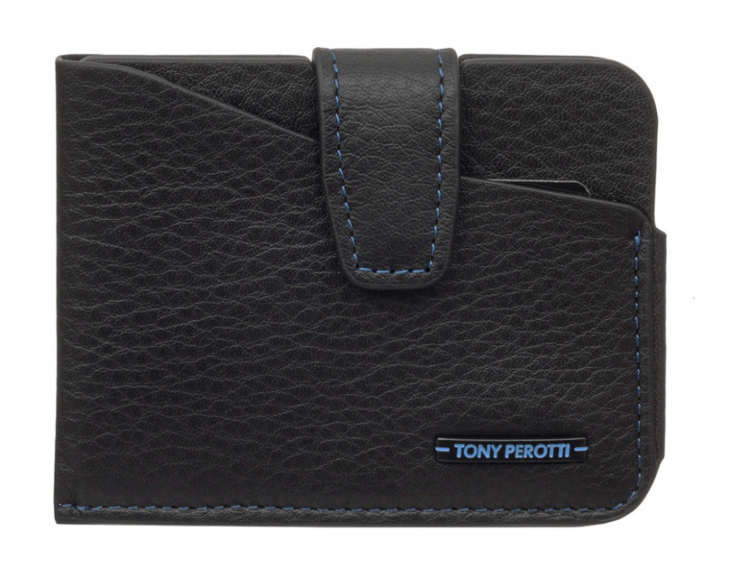 Выполнена из натуральной кожи высокого качества. Модель имеет горизонтальную форму. Имеет 3 отсека под кредитки / визитки. Закрывается на шлевку-кнопку, На лицевой стороне фирменныя надпись бренда - Tony Perotti.