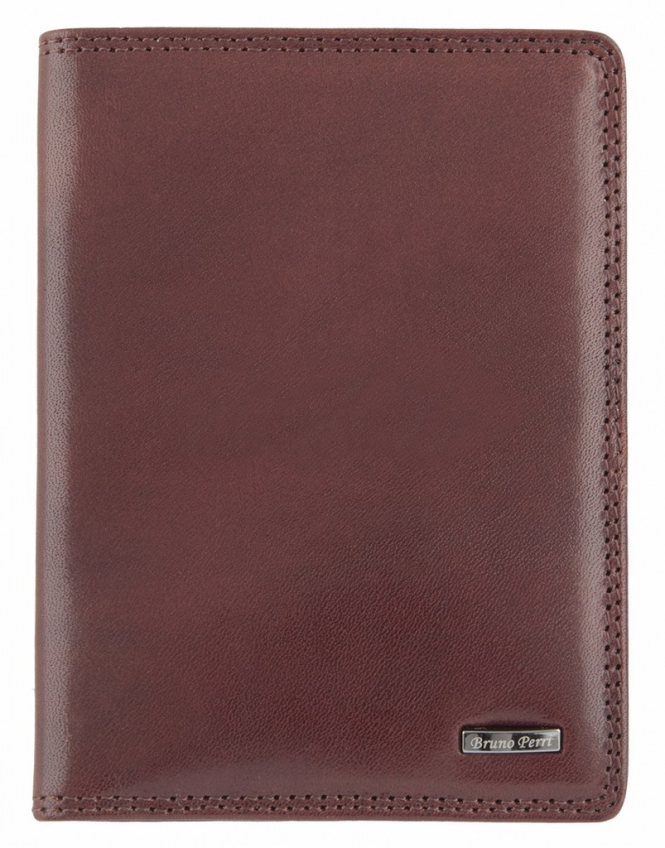 Выполнена из качественной натуральной кожи. Закрытие по типу «книжка». Внутри одно отделение для паспорта, 5 отделений для визиток/кредиток, один прозрачный карман. На лицевой стороне-фирменная надпись- Bruno Perri. Фурнитура-серебро.