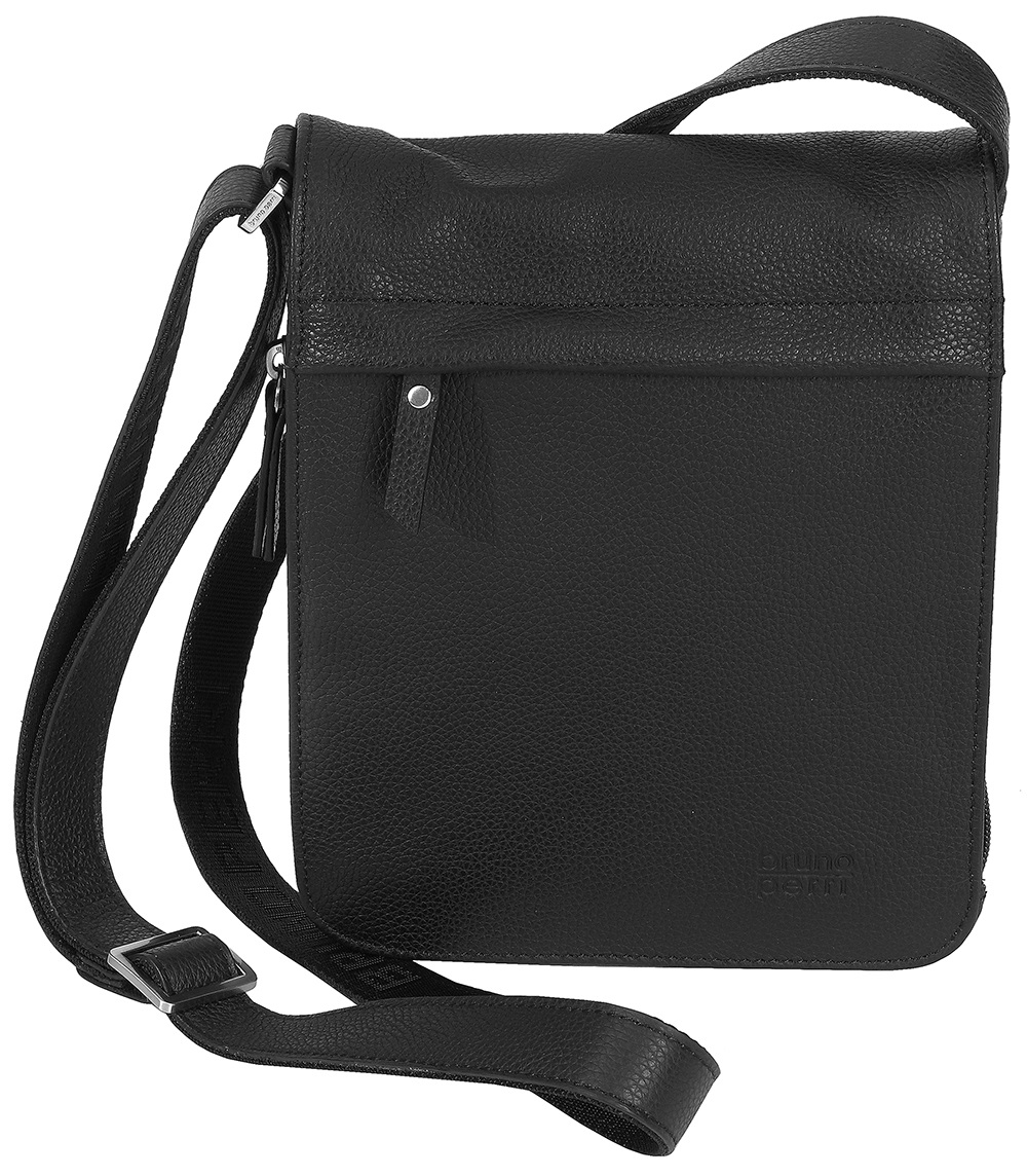 Выполнена из натуральной кожи высокого качества. Общее закрытие на клапан на магнитной кнопке. На клапане есть карман на молнии. Внутри одно отделение, отсек на молнии дополнительно, карман открытый. Под клапаном одно открытое отделение для принадлежностей. С тыльной стороны имеется отсек на липучке. На лицевой стороне фирменная надпись бренда-Bruno Perri.По периметру сумки есть молния, которая увеличивает вместимость сумки. Регулируемая ручка для ношения сумки на плече.