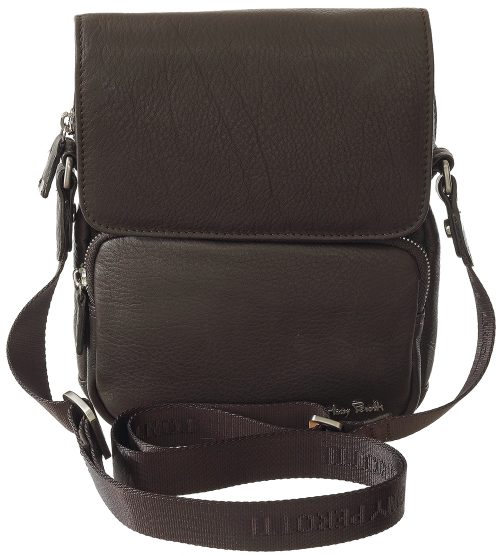 Выполнена из натуральной кожи высокого качества. Общее закрытие на клапан с кнопкой. На лицевой стороне есть горизонтальный карман на молнии. Внутри одно отделение, есть дополнительный отсек на молнии, открытый карман, отсеки для визиток/кредиток, петельки для ручек. С тыльной стороны отделение на магнитной кнопке. Ремень регулируется по длине. На лицевой и тыльных сторонах - фирменная надпись бренда -Tony Perotti.