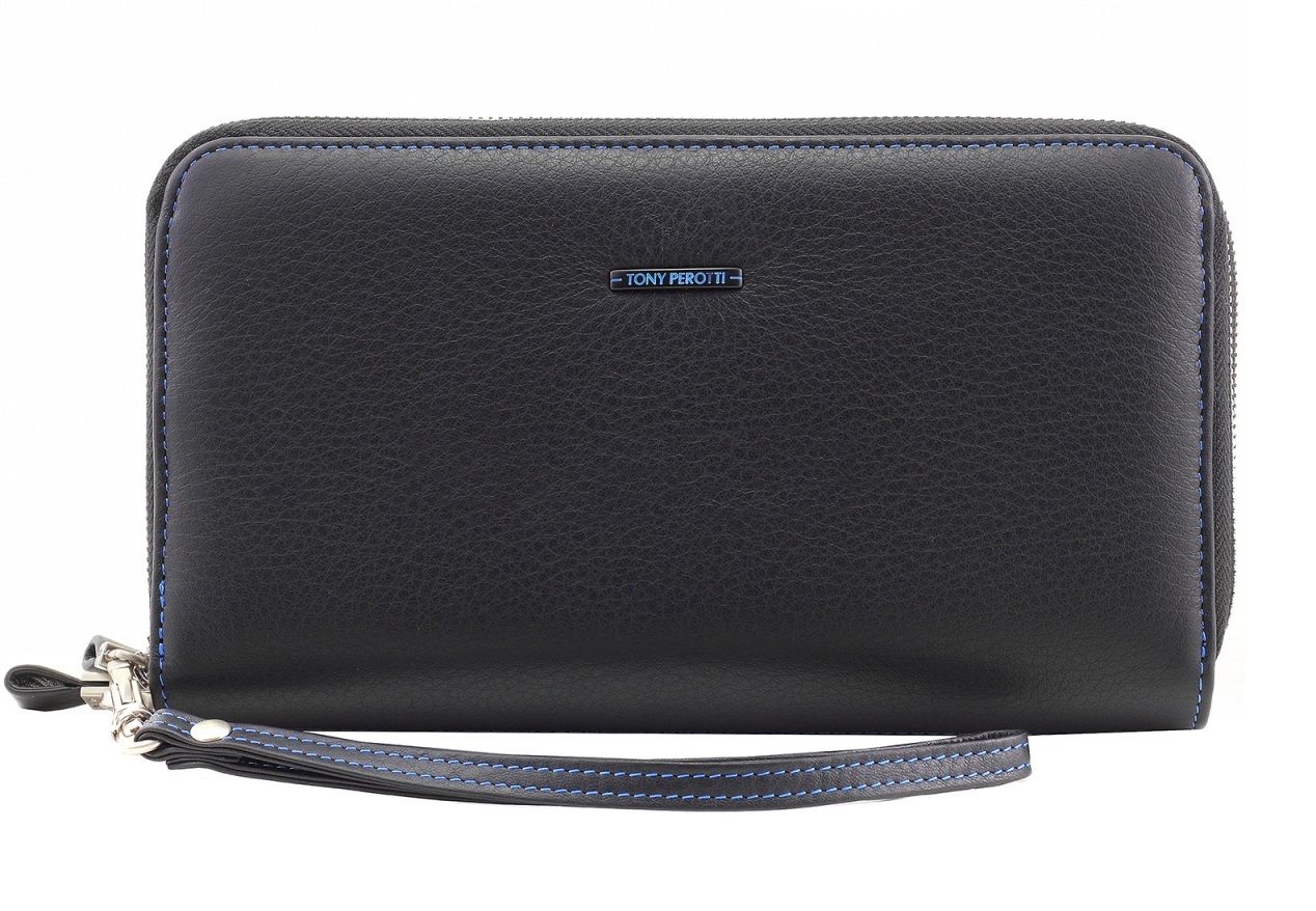 Выполнена из натуральной кожи высокого качества. Два основных отделения на молнии, два отделения для купюр, секция для мелочи на молнии. Шестнадцать отделений для визитных/кредитных карт, четыре дополнительных отделения. Ремешок для ношения на кисти руки в комплекте. На лицевой стороне фирменная надпись бренда – TONY PEROTTI. Контрастная синяя строчка и надпись делают продукт более выразительным.