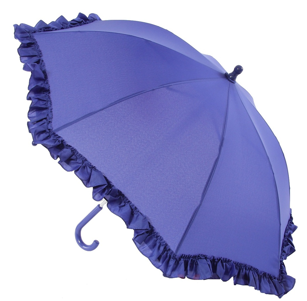 Детский однотонный зонтик-трость с пришитой пушистой рюшей по канту полиэстерового купола зонта. Производитель очень строго отслеживают свое производство, для изготовления детских зонтов используются самые безопасные и прочные материалы и придумывают максимально возможные варианты безопасных конструкций.